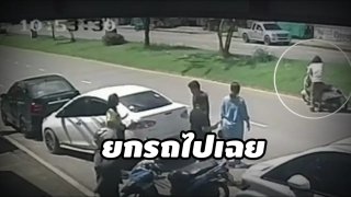 นทท.ขี่รถจยย.เสยท้ายเก๋ง ล้มไถล ก่อนลุกขึ้นงงๆ แล้วขี่หนี