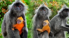 "ลูกค่างสีส้ม" ลูกน้อยน่ารักของ "ค่างหงอก" ที่ตัวเล็กกับตัวเต็มวัยนั้น สีแตกต่างกันเป็นอยางมาก