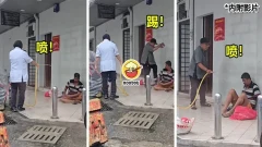 เจ้าหน้าที่รักษาความปลอดภัยธนาคาร ทั้งหญิงและชายใช้น้ำฉีดไล่คนไร้บ้าน