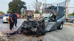 สลด! กระบะบรรทุกหมากพุ่งอัดใต้พ่วง 20 ล้อ คนขับเสียชีวิตคาซากรถ ที่โพธาราม