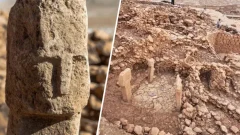 เสาหินแกะสลักใบหน้ามนุษย์อายุประมาณ 12,000 ปี ที่โบราณสถานคาราฮาน เทเป ในเมืองซานลีอูร์ฟา ประเทศตุรกี