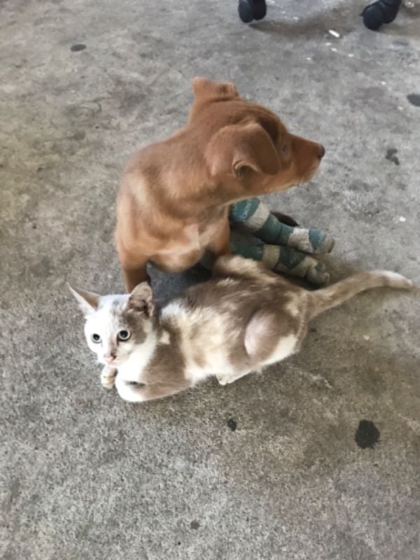 PoomiizZหมาโดนฟันมา ใส่เฝือกขาหลัง2ข้าง แมวมาคอยดู โดนฟันแล้วเอามาปล่อยไว้ในกู้ภัย เลยต้องพาไปทำแผลรักษากันเอง